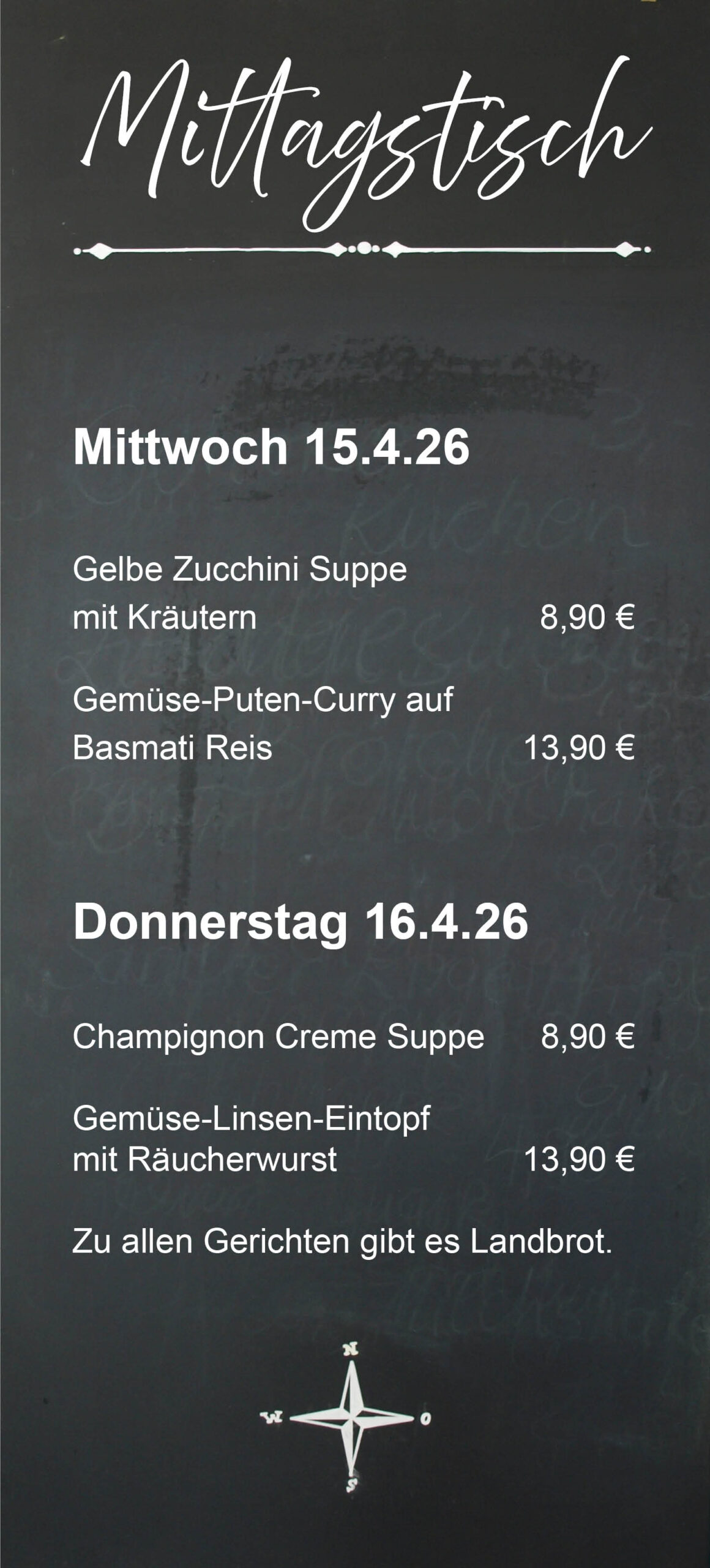 Eines vorweg: Auch wenn ich gelegentlich leckere Fischbrötchen anbiete, wir sind kein Fisch-Restaurant. Wenn Sie aber Ihre wohlverdiente Mittagspause in freundlichem Ambiente verbringen möchten, bieten wir Ihnen Mittwoch und Donnerstag den idealen Mittagstisch: